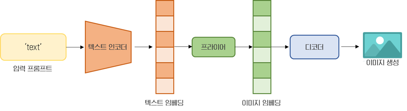 DALL-E2의 구조는 입력 프롬프트, 텍스트 인코더, 텍스트 임베딩, 프라이어, 이미지 임베딩, 디코더로 구성되어 있습니다. 먼저 텍스트가 텍스트 인코더를 통과하여 임베딩 벡터가 만들어 집니다. 이 벡터는 프라이어에 의해 변환되어 이미지 임베딩 벡터가 됩니다. 마지막으로 이미지 임베딩 벡터가 원본 텍스트와 함께 디코더에 전달되어 이미지를 생성합니다.