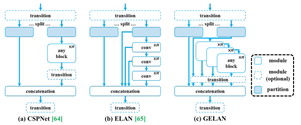 그림4. GELAN의 아키턱쳐 : CSPNet을 모방하고 ELAN을 모든 계산 블록을 지원할 수 있는 GELAN으로 확장합니다.